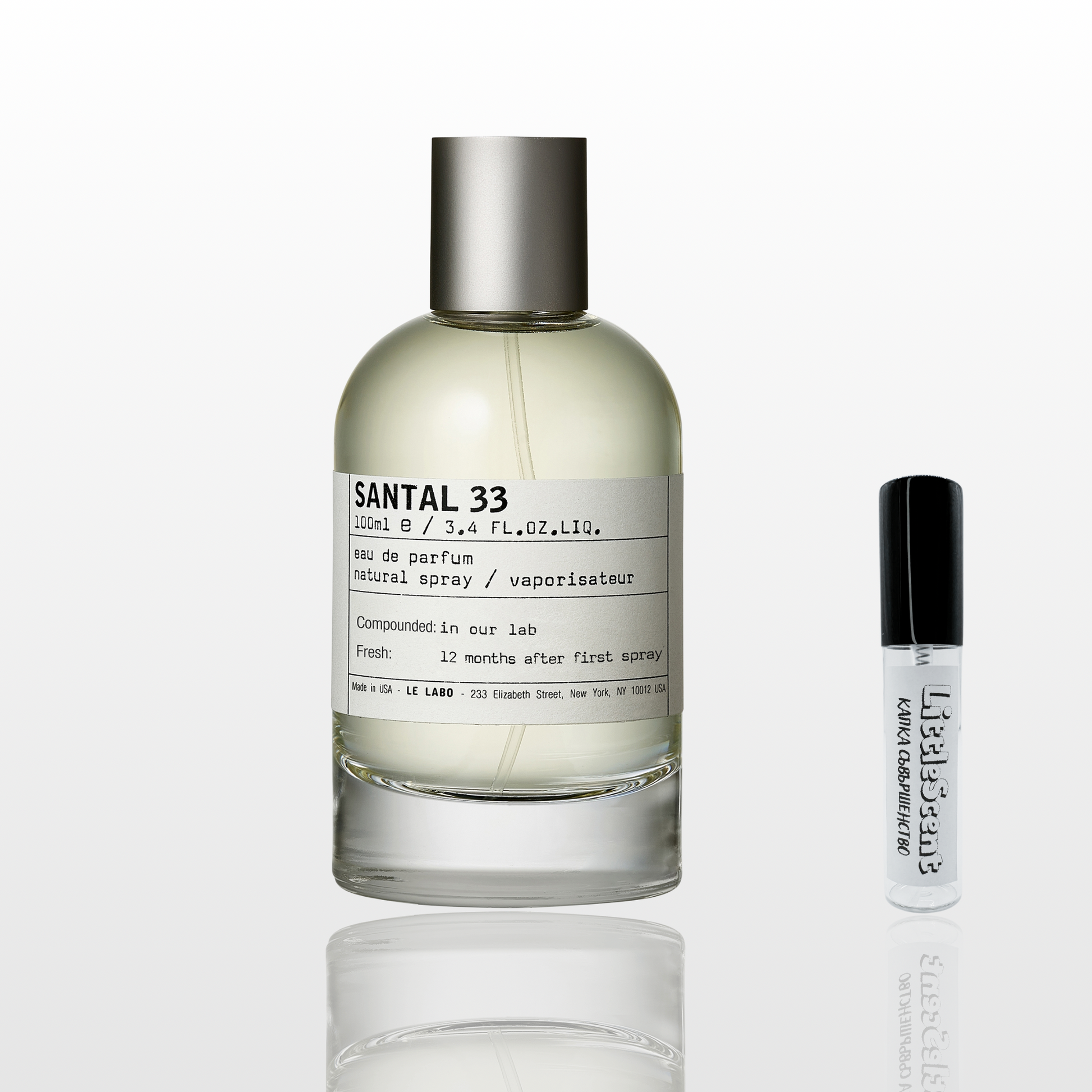 Парфюмната вода Santal 33 на Le Labo е ароматен, пристрастяващ и успокояващ аромат, който предизвиква димния аромат на открит огън. Нотки на кардамон, ирис, теменужка и амброкс се разтапят в дървесни акорди на австралийско сандалово дърво, папирус и кедрово дърво, за да създадат пикантна, ароматна основа. Този аромат има пикантни, кожени и мускусни нюанси, които му придават унисекс идентичност и пристрастяващ комфорт. Определяща картина на духа на американския Запад, с всичко, което предполага за мъжество и лична независимост, изразяваща целта да се създаде обонятелна форма, вдъхновена от великия американски мит, който остава източник на въображение за останалата част от земното кълбо.