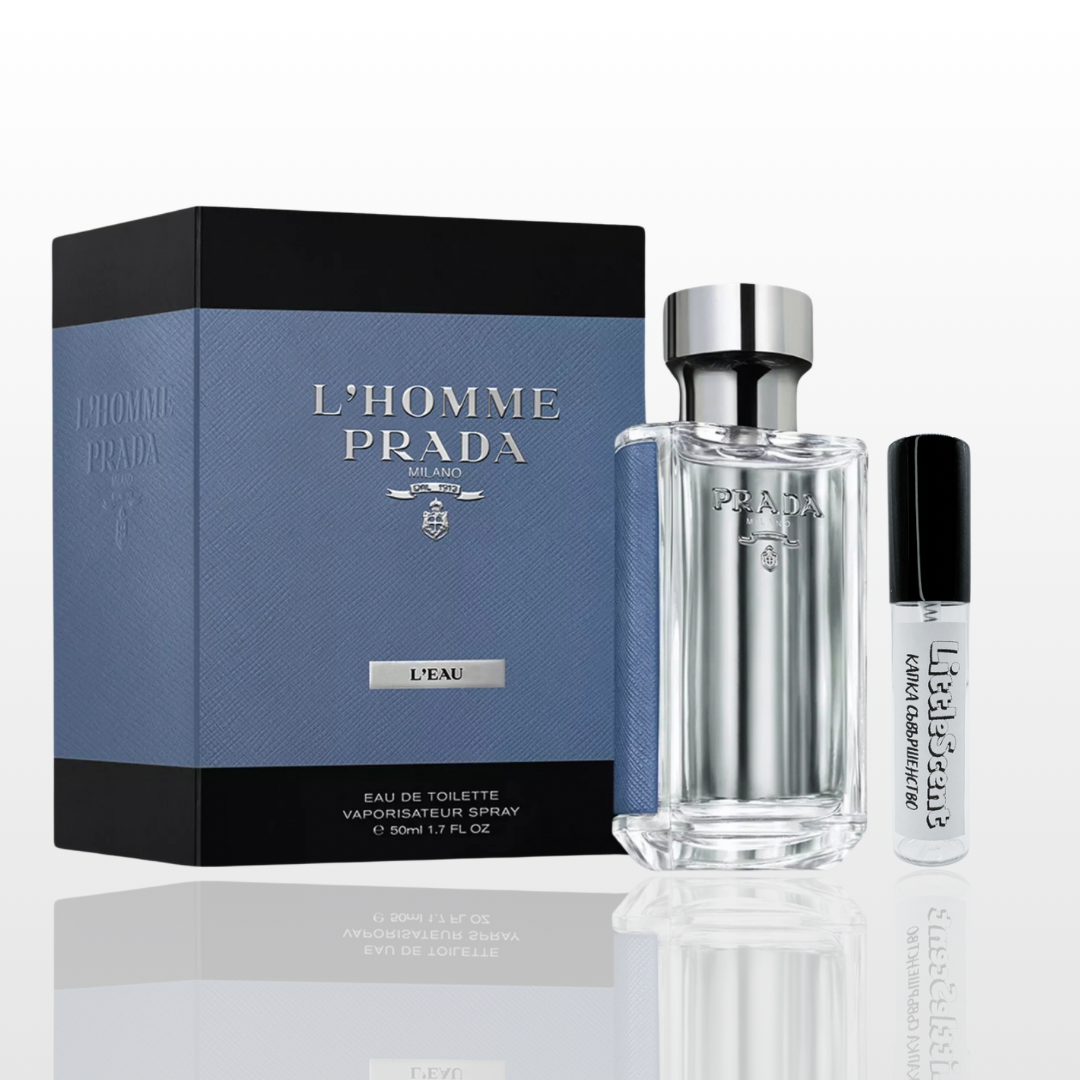 Prada L`Homme L`eau е създаден за елегантните и уравновесени модерни мъже, които обичат да обръщат внимание на малките детайли, когато става дума да личния им стил. Ароматът се открива с джинджифил и бляскаво нероли. В основата откриваме прекрасен ирис, обгърнат в луксозен кехлибар. Изборът на ирис не е случаен. Много народи вярвали, че това цвете е символ на воинския дух, а мъжественото му ухание носело сила. Състава е прекрасно завършен с акорди сандалово дърво, кедър и интересни прахообразни нотки. Визията и формата на стъклената бутилка са истински дизайнерски шедьовър, който опрделено трябва да притежавате в колекцията си!