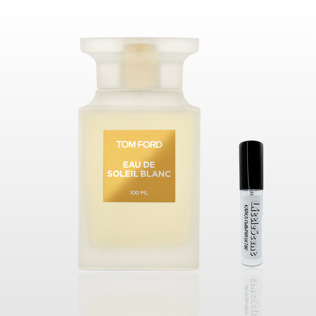 Парфюмът TOM FORD Eau de Soleil Blanc е лансиран през 2018 г. Unisex ароматът е вдъхновен от небето и горещото слънце. Подходящ е за силни мъже и чувствени жени, които имат вътрешна сила и енергия. Ароматът се отваря в началото със сложен състав от леки нюанси на цитрусови плодове - лимон, горчив портокал, бергамот, които контрастират с розовия пипер, кимион, шам фъстък. В страстното сърце са скрити акордите на иланг-иланг, цветя от Коморските острови, жасмин, тубероза, които се събират на зазоряване. Сладката симфония завършва от кокосови нотки, ванилия, бобчета Тонка заедно с кехлибар и бензоин.