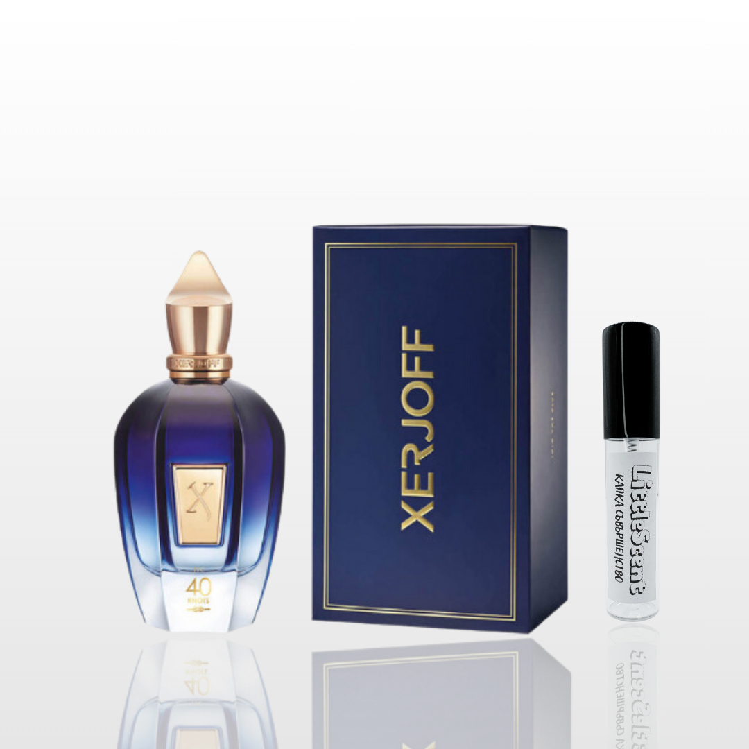 Xerjoff 40 Knots e интензивен унисекс парфюм, част от завладяващата колекция "Join The Club". Това ухание се усеща като лек допир на морски бриз по кожата, докато сте на борда на луксозна яхта, плаваща из кристално чистите води на Средиземно море. Xerjoff 40 Knots е лансиран през 2012 година и е идеален за мъже и жени, които търсят изтънчен и изискан парфюм, който отговаря на техния неподражаем стил. Съчетанието от дървесни нотки и кедър поднася вълнуващо начало, носещо усещане за устойчивост и топлина. В сърцето на аромата, откриваме морски нотки, които напомнят за вълнението и тихия шепот на морския бриз, докато нотката на сол добавя автентичен акцент, който пробужда спомени за летни приключения по морските брегове. За финал Xerjoff 40 Knots е украсен със сладостта на зелени тревисти тонове, които изпълват въздуха и ни напомнят за красотата на природата.